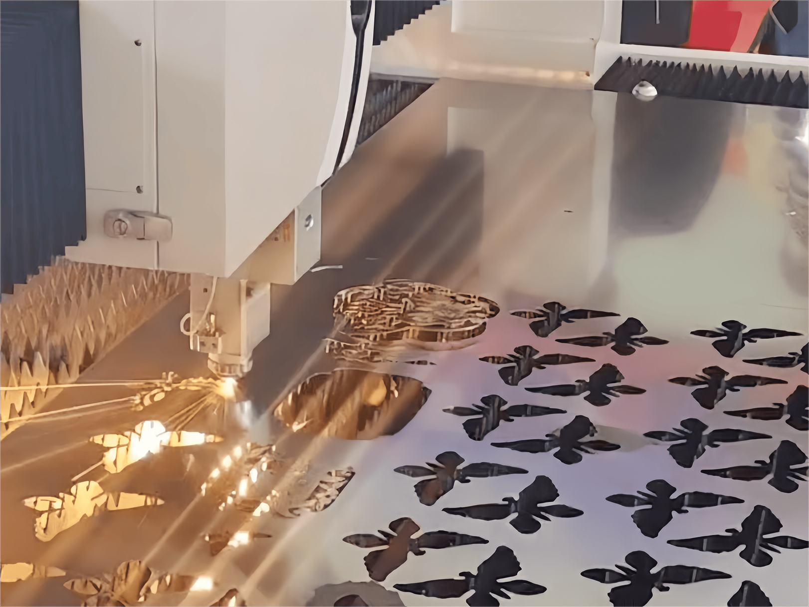 Gearradh pláta meánach agus tiubh:Maidir le plátaí meánacha tiubha, is féidir fócas dearfach agus fócas diúltach a úsáid. Éilíonn fócas dearfach go leor cumhachta léasair agus brú gáis cúnta. Agus fócas diúltach á úsáid agat, is iondúil go bhfuil an fócas suite ag 1/3 go 1/2 de thiús an phláta, ag soláthar gearrtha níos cobhsaí agus ag laghdú garness ar an dromchla gearrtha.